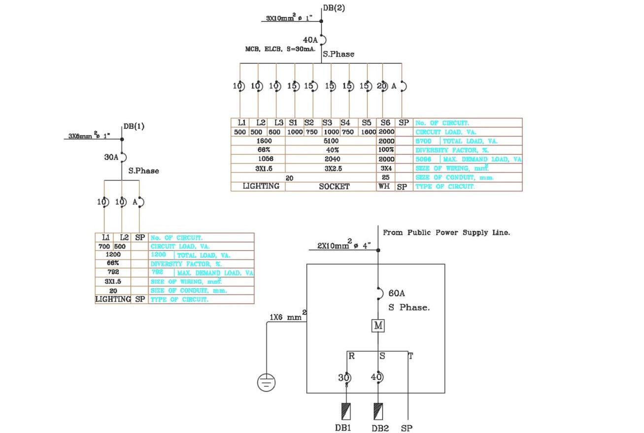 Download free DWG file of electrical distribution board CAD drawing shows power supply chain includes types of circuit, socket, size of wiring and lighting detail.