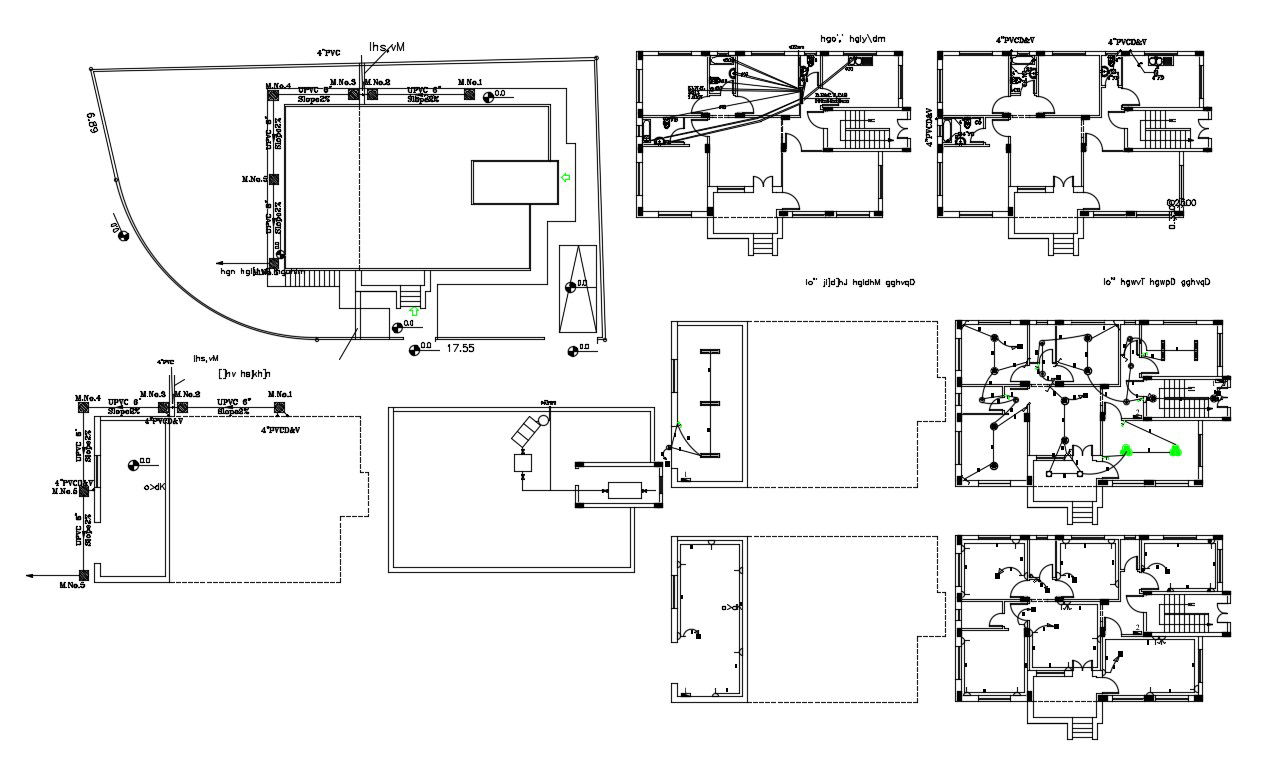 2d CAD drawing of architecture house site plan, plumbing line plan, electrical layout plan, and sanitary ware detail. download DWG file of construction house CAD drawing.