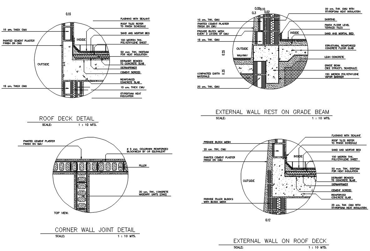 2d CAD drawing of dermabit bonded to concrete slab to wall structure, also provide external wall rest on grade beam, roof deck detail, corner wall joint detail, and external wall on roof deck. download Free DWG file wall section drawing with description detail.