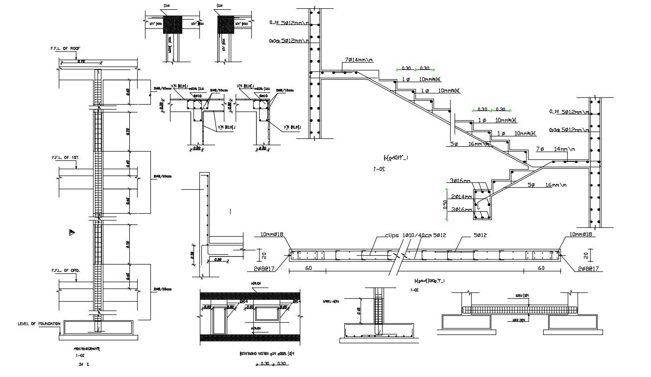 2d CAD drawing of RCC construction structure drawing includes the load transfer sequence in RCC column, beam, foundation and staircase with reinforcing size details. download free DWG file of RCC structure design.