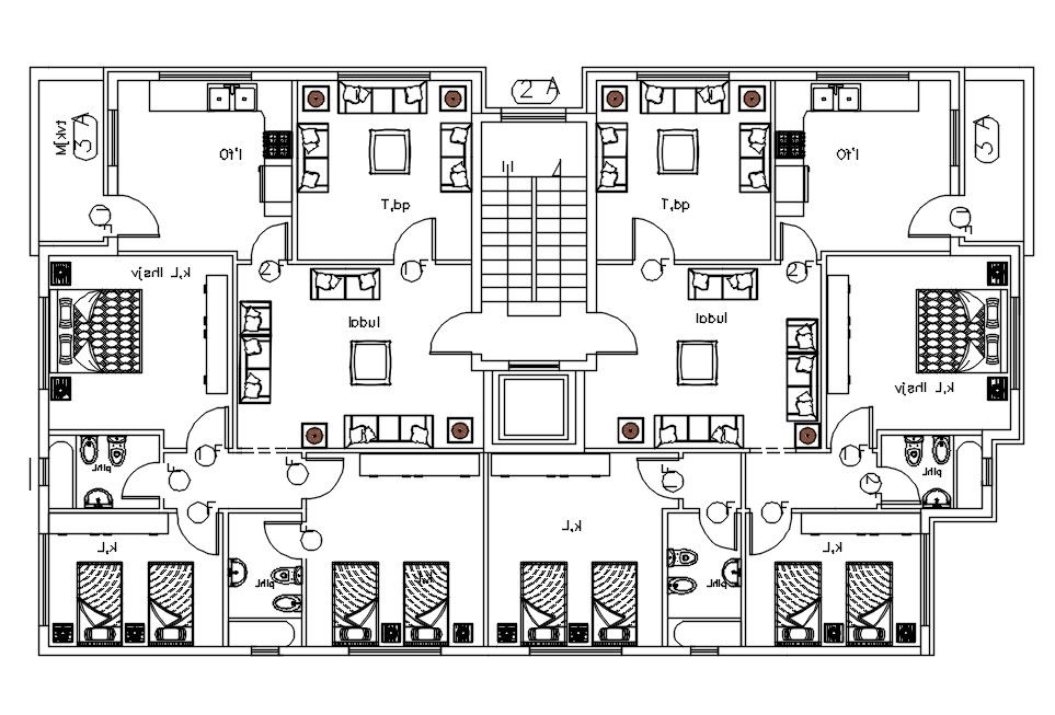 the architecture apartment furniture layout plan CAD drawing includes 3 bedrooms, kitchen, drawing room, living room, dining area, lift elevator with staircase detail. download the DWG file of the apartment project and use this idea for your new project.
