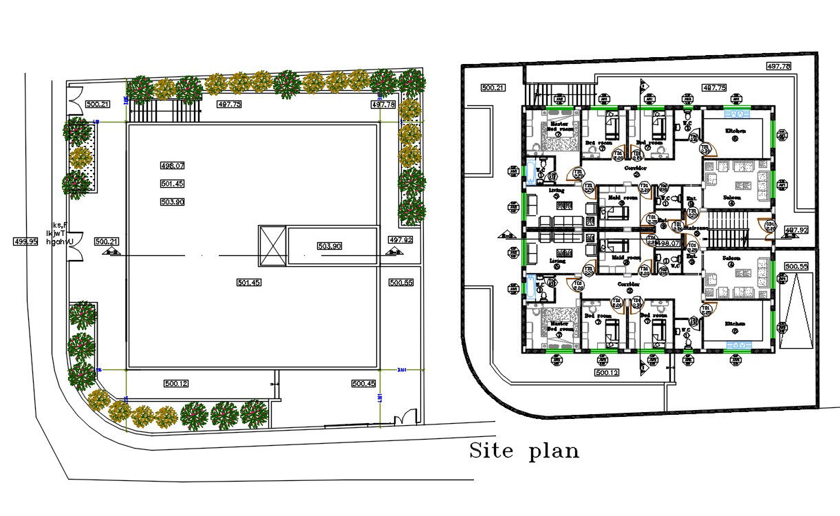 the architecture apartment project AutoCAD drawing includes 3 bedrooms, modular kitchen, drawing room, living lounge, and dining area with all furniture layout plans. this is a cluster apartment plan in 2 house units design. download DWG file of the apartment floor and also get site drawing.