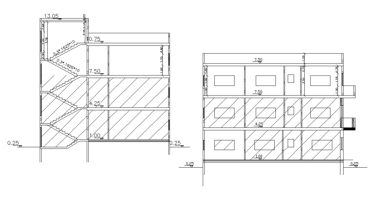 it's a two-sections of simple building with floor dimension details, details of stair section, some structure details in it, this is the DWG file format.