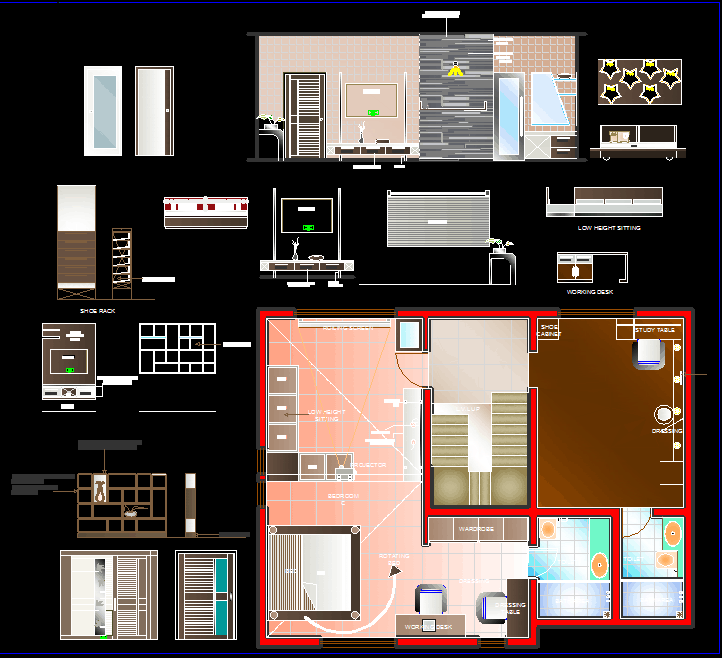 Hotel room Interior design AutoCAD DWG Drawing file is given. In this Plan, a hotel bed with attached dressing, bath, and toilet room are available. In addition, a projection room, drawing room, TV unit design, wardrobe 2d drawings are given. This drawing will be useful for civil engineers, architects, and interior designers. Download the AutoCAD Drawing file.