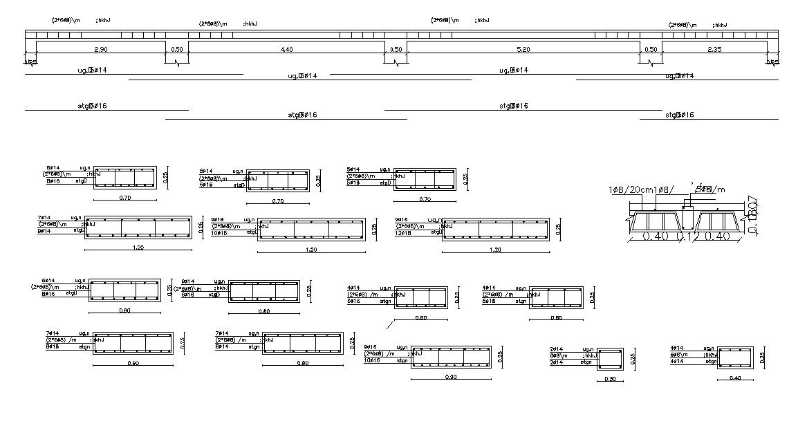 this is the DWG drawing of column and beam reinforcement details, bars joints desing, some texting and dimension related to drawing.