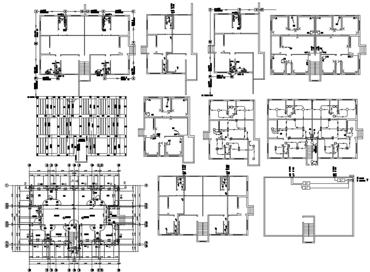The architecture residence house plan CAD drawing shows reinforce slab joint bar detail, plumbing plan, electrical layout plan and house ground floor plan with dimension and centre line detail. download house plan design DWG file.