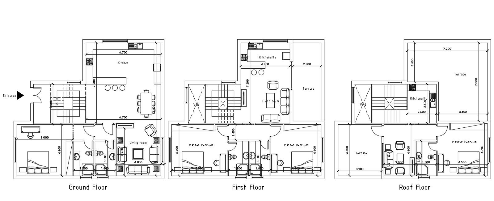 the architecture family house project CAD drawing shows ground floor, first floor and second-floor plan includes master bedrooms, drawing room, living area, kitchen and open terrace with dimension detail. download DWG file of house project.