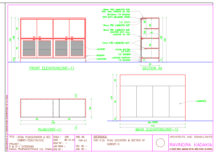 This Cabinet Elevation design in front elevation side section, Back Elevation, Plan Lay-out detail.