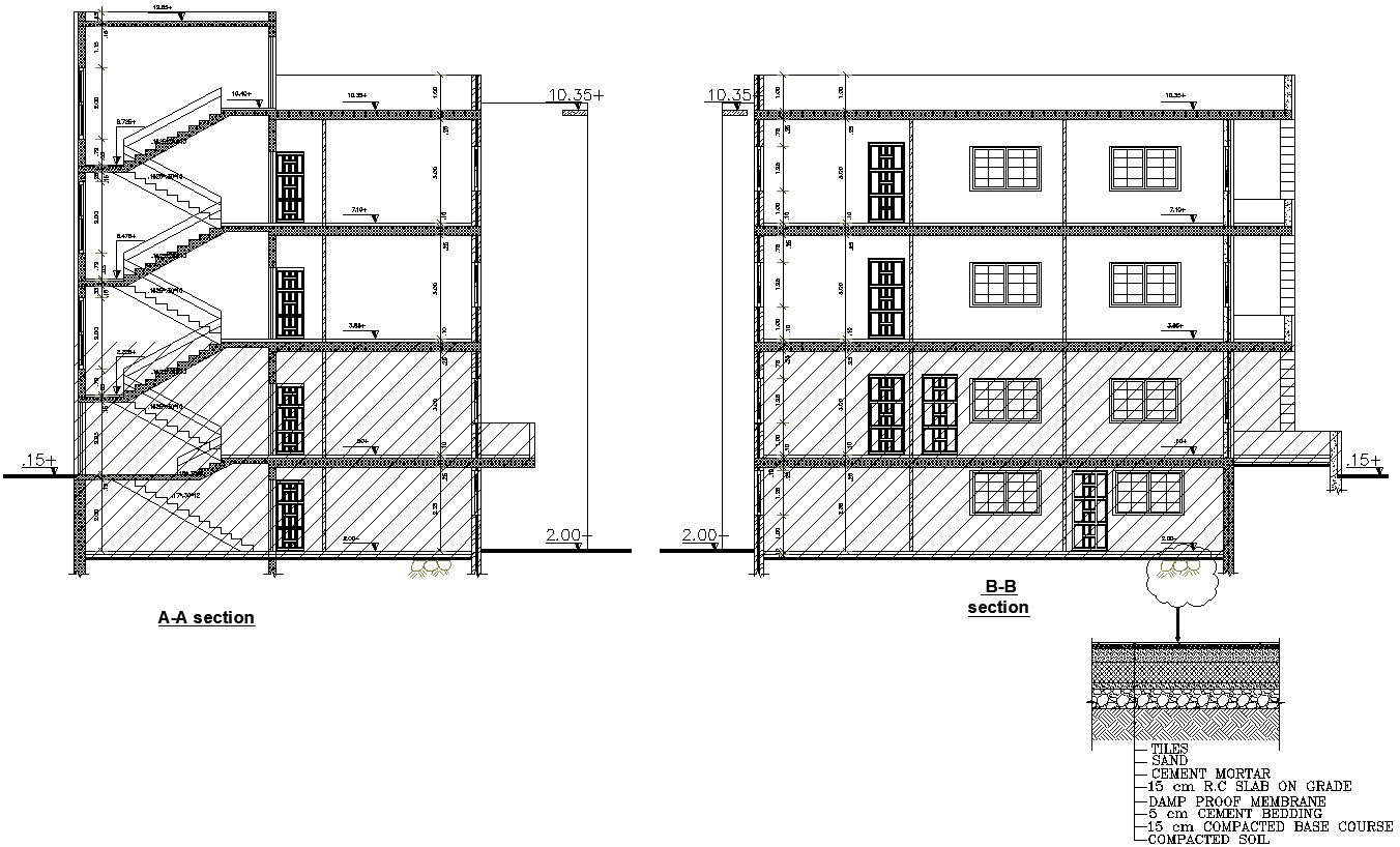 this is the section of four-floors flat building with floor levels dimension , structure details, standard section of stair, flooring section details, and much more other details related to the structure, its a DWG file format.