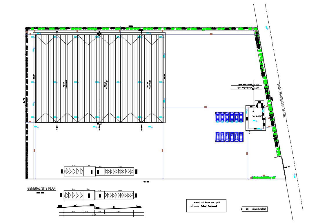 Download free DWG file of factory site plan with area construction build-up area, landscaping design and all dimension detail.