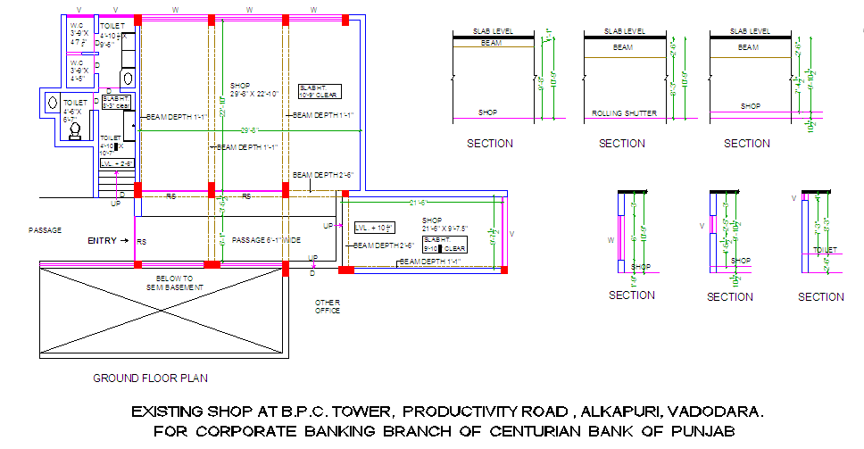 This Design in beam depth 1'1" size, toilet detail, Shop detail, passage size 6', & section & lay-out design include.