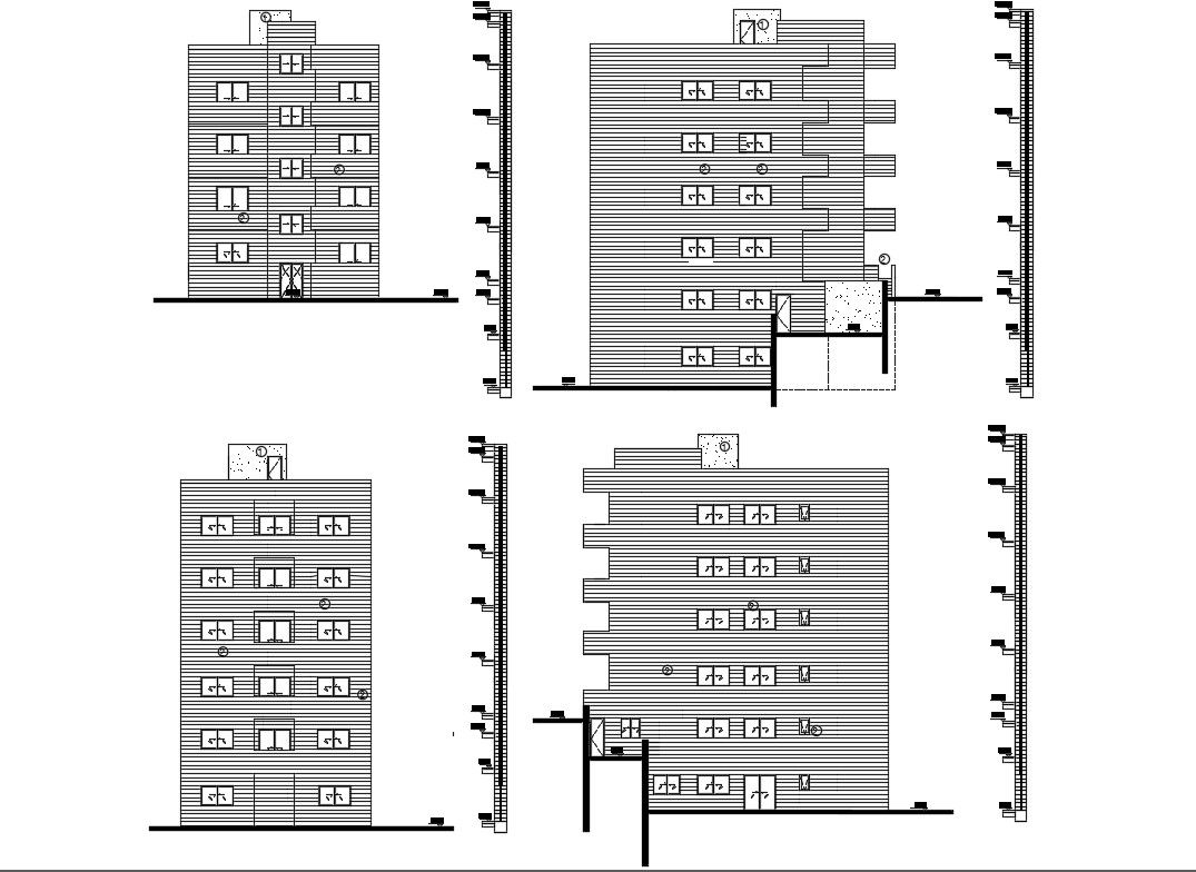 architecture apartment building all side elevation design with dimension detail. this is the simple elevation drawing which shows viewed from a number of different angles. download DWG file of apartment building design.