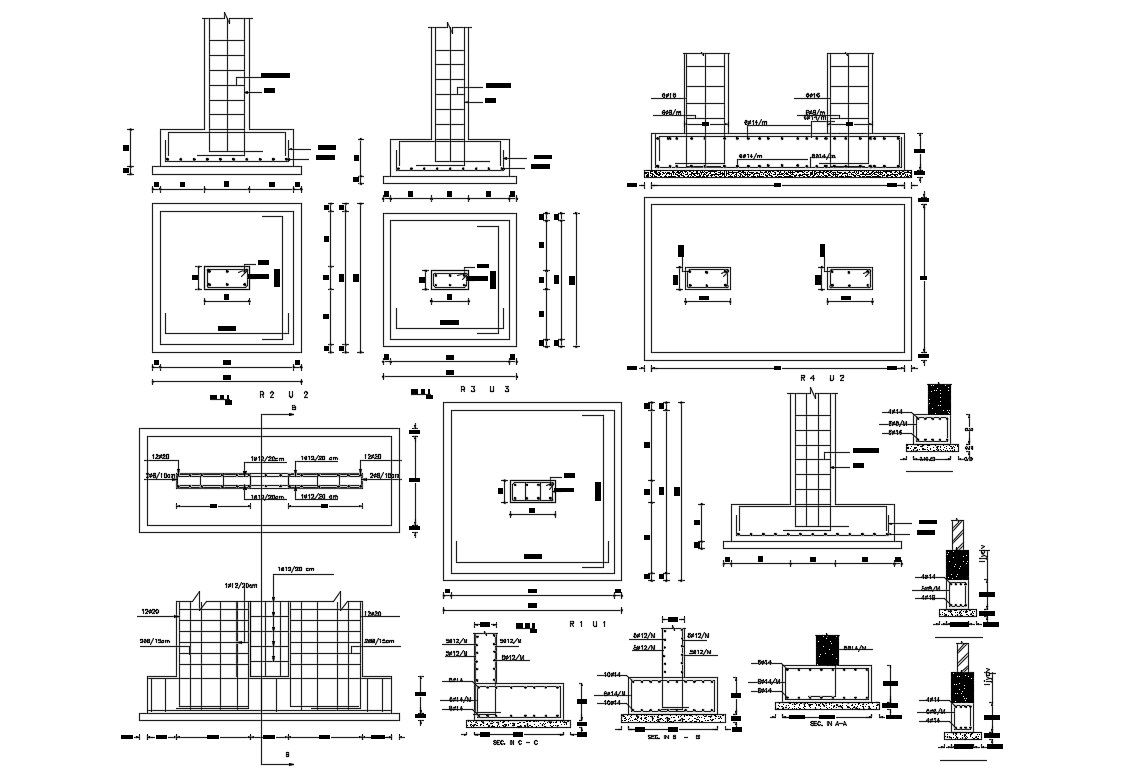 RCC reinforcements to stand the transverse load that usually builds upon the supports on foundation column blocks CAD drawing includes joint foundation pad footing side view and top plan. download DWG file of RCC construction design.