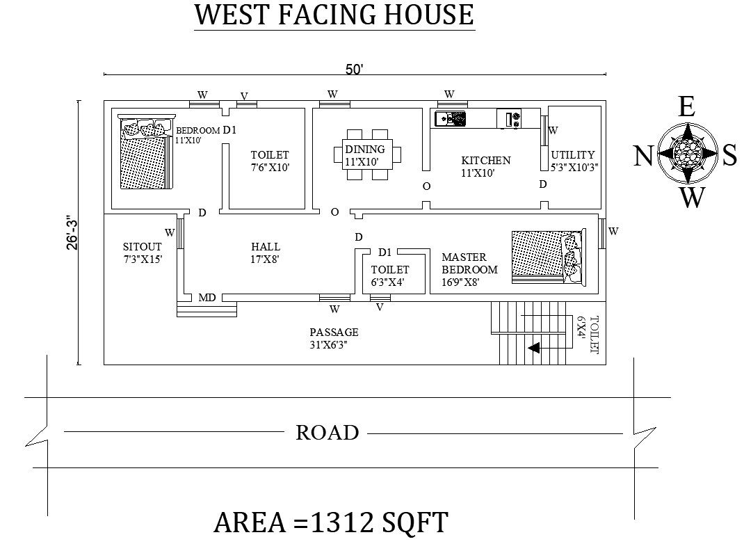 This is West Facing House Plan As Per Vastu Shastra. Total Land Area of the plan is 50'x26'3" Buildup Area of the house is1312 Sqft. Download PDF and DWG file format of this House plan.