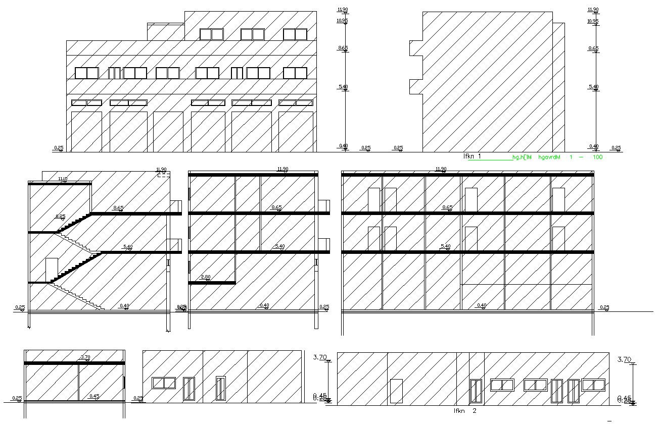 this is the many elevations and sections of residential building with floor levels dimension design, stairs section, structure desing, doors, ventilation and windows details, hatching in building.