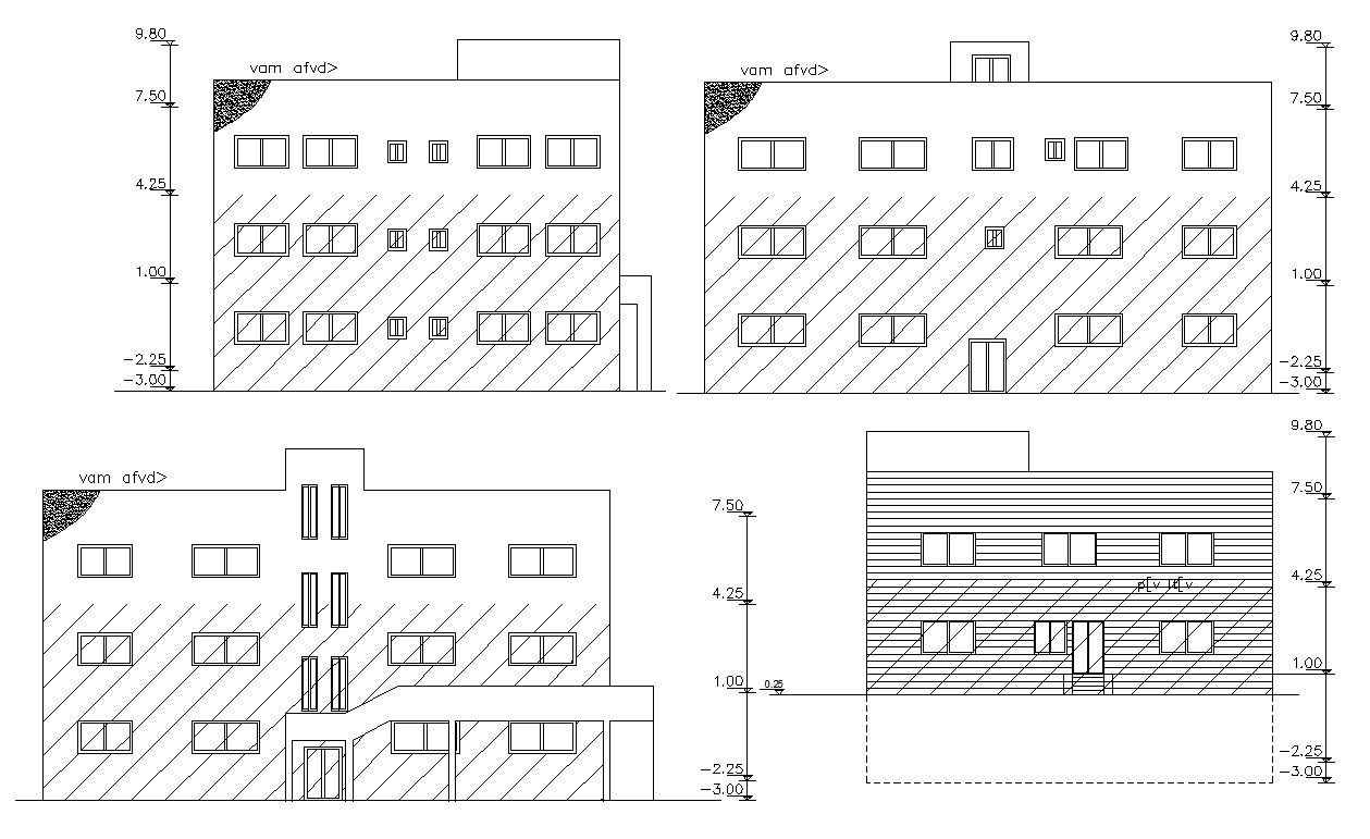 this is the levation of residential building with some hatching design, this is a three-story building with levels dimension details, doors windows design and much more other details in it.