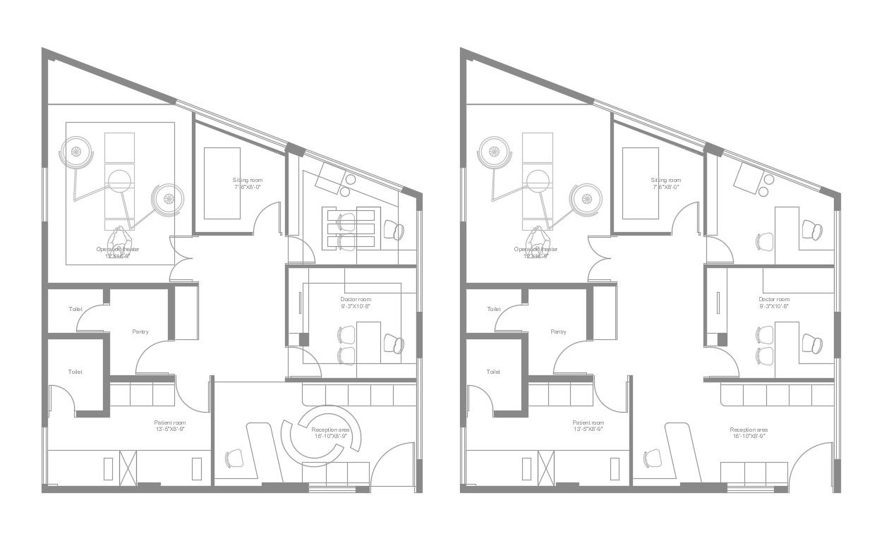 CAD drawing details of hospital building two types of optional furniture layout plan that show hospital building amenities details of the reception area, doctor room, operation theater, pantry, washroom, patient room, sitting room, and various other download AutoCAD file for the detailed design plan.