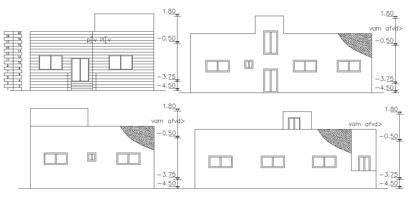 this is the drawing of residential architecture building four side elevation with floors levels dimension details, some hatching details in elevation, its a simple style elevation design.