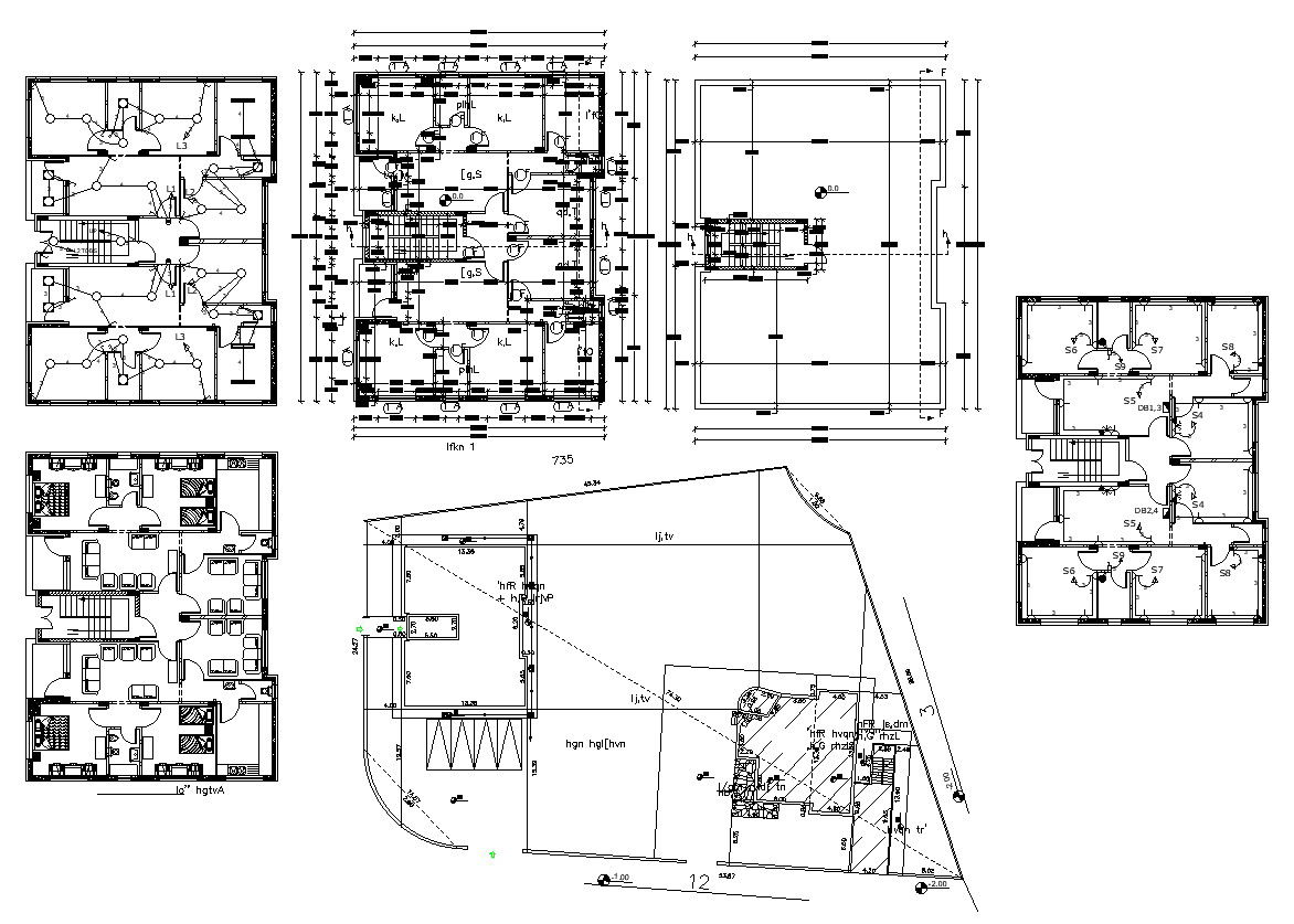 this is the planning of 2BHK apartment includes furniture layout design, electrical plan, working drawing dimension, terrace floor plan with dimension, site and building demarcation drawing, parking layout on the ground floor.