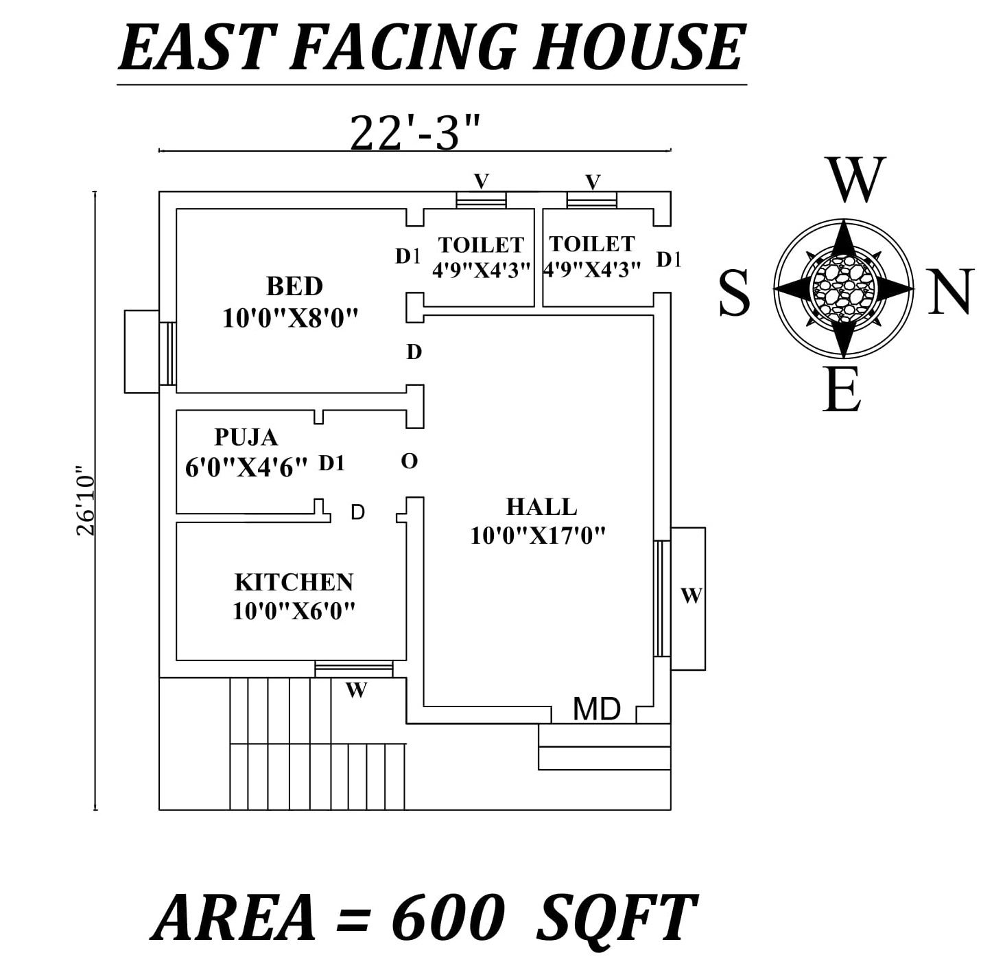 Autocad Drawing details of 22'x27' Single BHK East Facing House Plan As Per Vastu Shastra. The buildup area of this house is 600Sqft.Download Autocad Drawing File and Pdf.