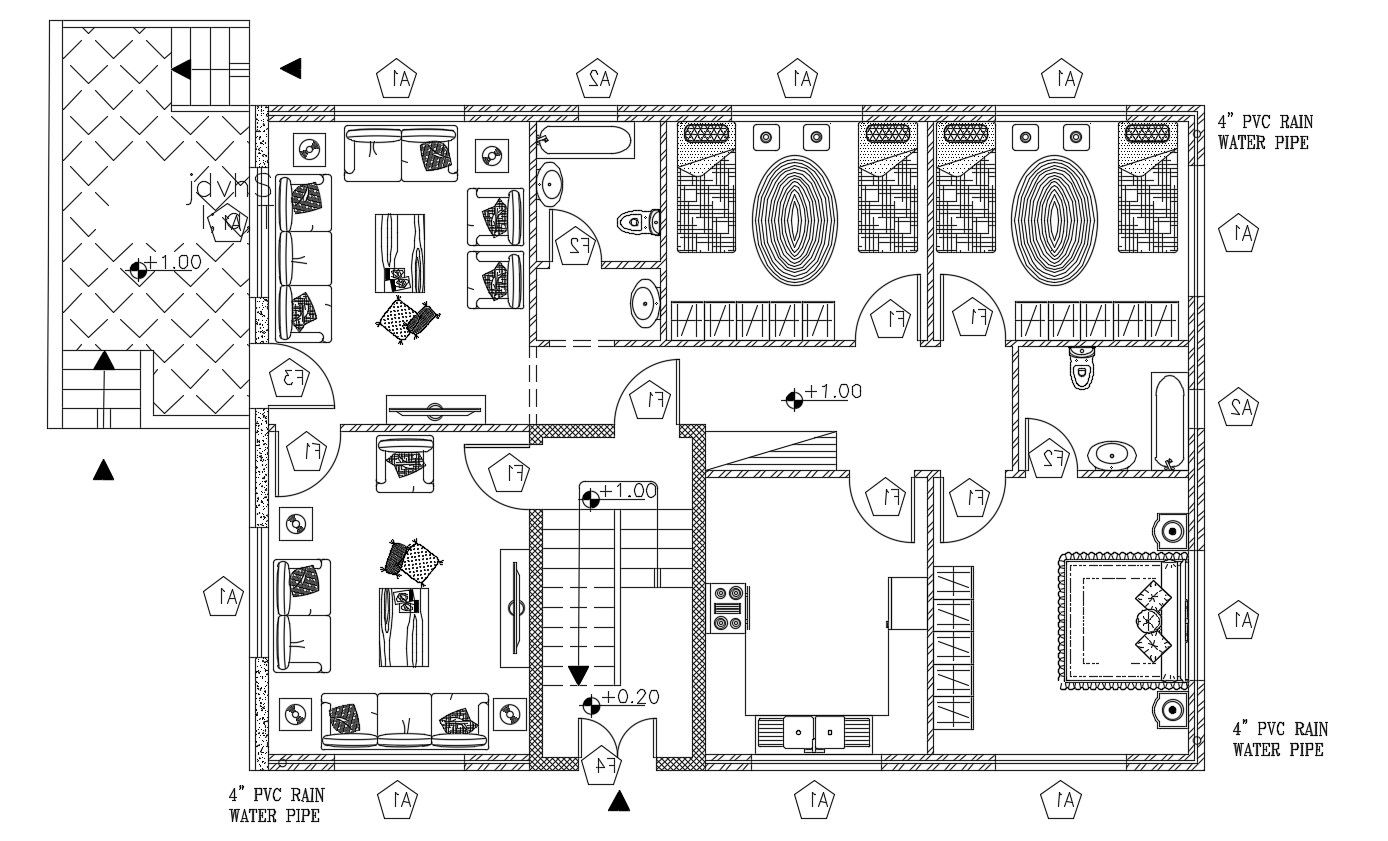 this is the planning of a huge bungalow plan includes fully furnished layout, in this plan, added main foyer, 3bed rooms, kitchen, living and drawing room, common toilet stair has used both sides, it's a modern house planning.