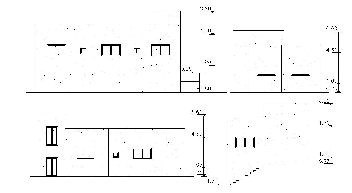 this is the simple single storey house elevation design which viewed from a number of different angles with dimension detail, download DWG file of architecture house building design.
