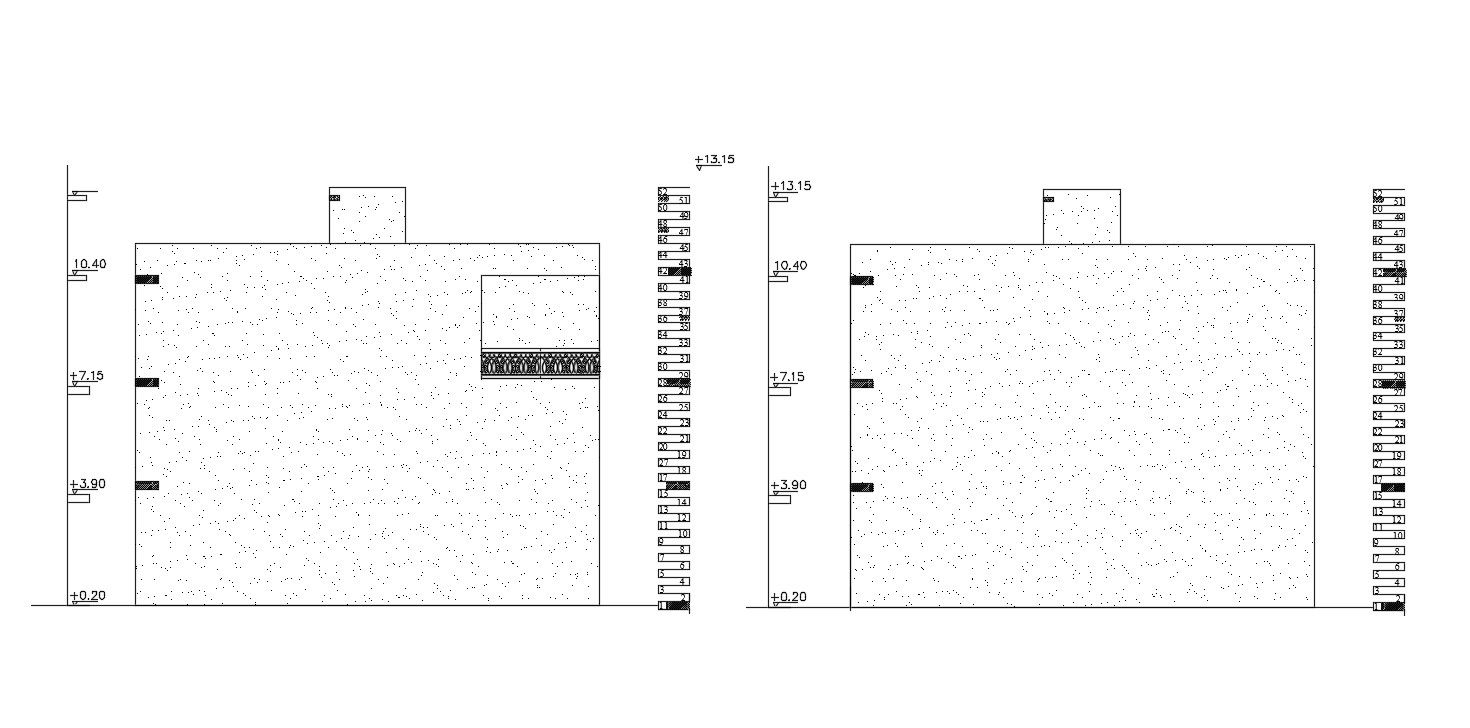 this is the two simple elevation of residential building with floor levels dimension details, hatching design in elevation, traditional balcony railing elevation, it's a simple elevation architecture design.