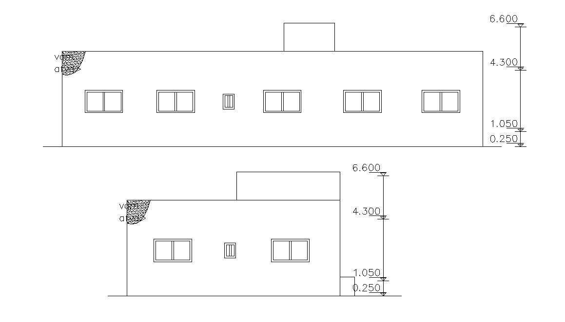 Download free DWG file of residence house single storey building elevation design with dimension details.