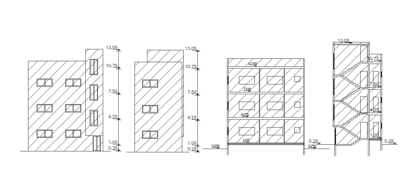 this is the 3 storey residence house building section drawing and elevation design which shows floor level detail, staircase section and RCC slab design. download house building design DWG file.