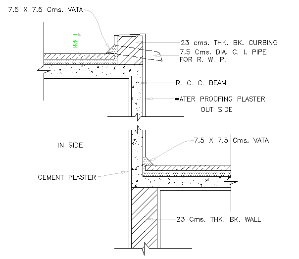 Water Proofing plaster out side, R.C.C Beam, 23 Cms. THK. BK. WALL, 23 cms. THK. BK. CURBING, 7.5 Cms. DIA. C. I. PIPE FOR R. W. P. etc detail.