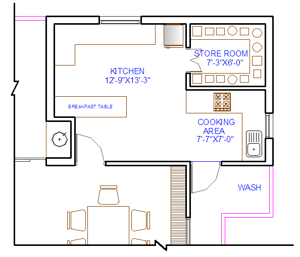 Kitchen Design In Breckfast table, Store Room, Cooking area, Wash area detail include the lay-out design.