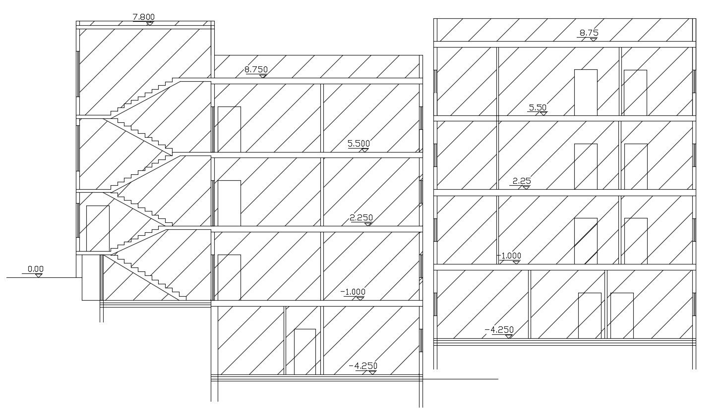 this is the two sections of architecture residential building with floor levels height marking, stairs section design, doors and windows details.