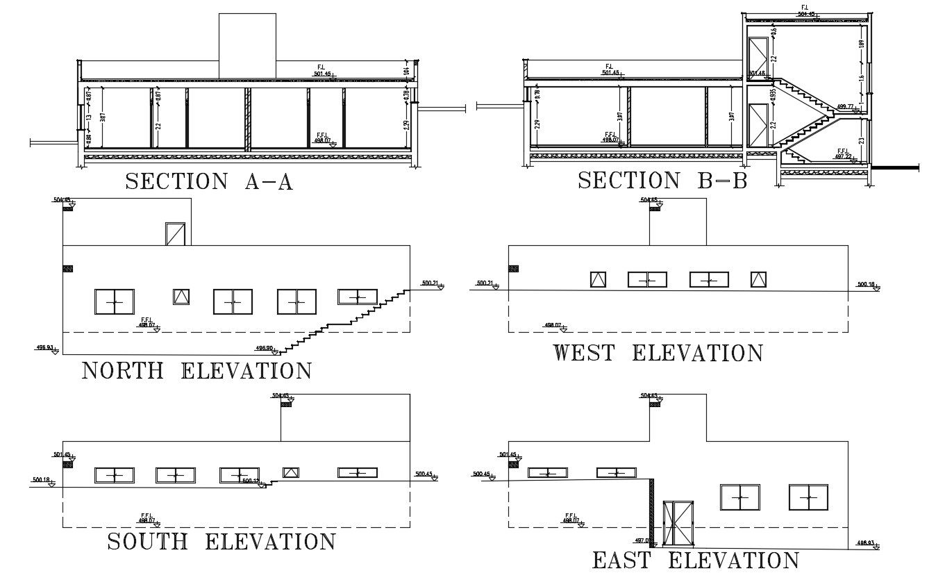 this is the drawing of elevations and sections details with floor levels dimension details, stair section design, its a four side elevation of house and doors and windows desing in elevation.
