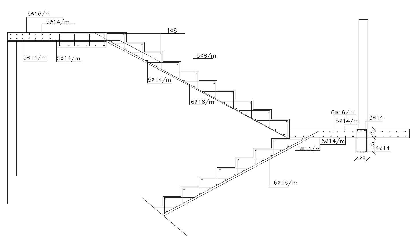 this is the drawing of stair section details with internal reinforcement design. landing team design bars dia marking and much more other details.