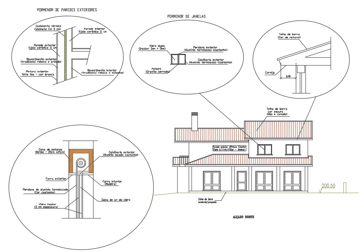 The interior design CAD drawing of north-facing house elevation design CAD drawing shows detail of outer walls, windows, clay tile (natural colour), exterior frames, and cladding design. this is 2 storey house building design download in DWG format.