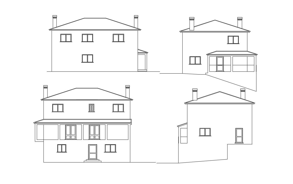 Residence house building elevation design CAD drawing shows 2 storey building floor level and chimney clipart elevation design with a number of different angle view design. Download residential building design DWG download.