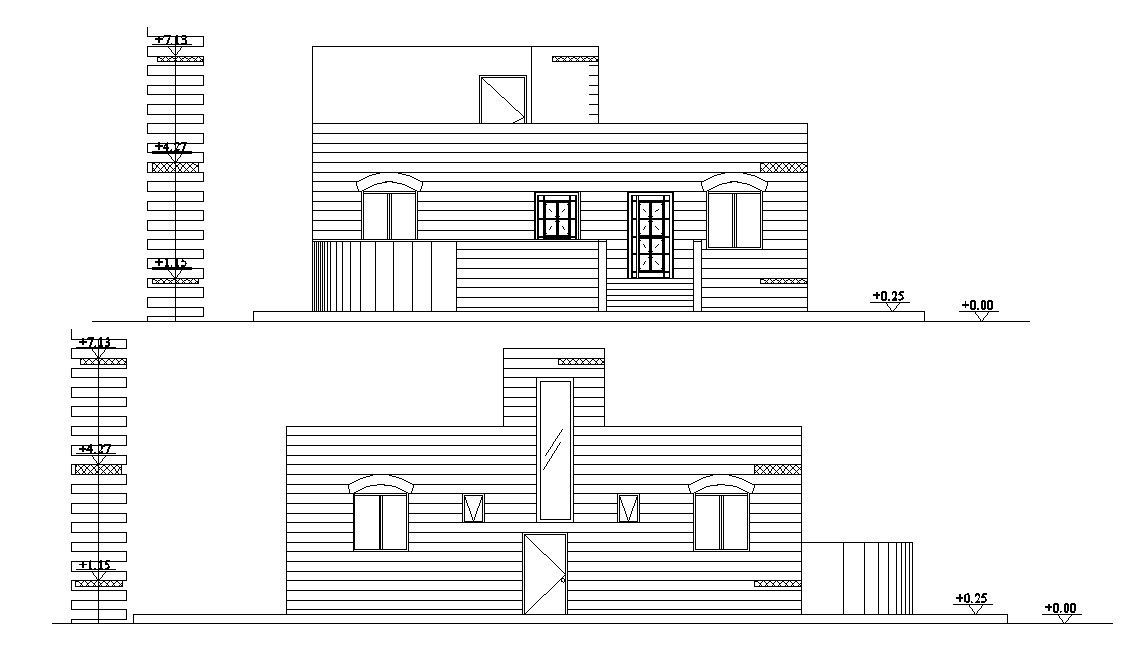 Single storey house building rear and front elevation design CAD drawing shows wall texture, door and window design. download DWG file of house building design AutoCAD drawing.