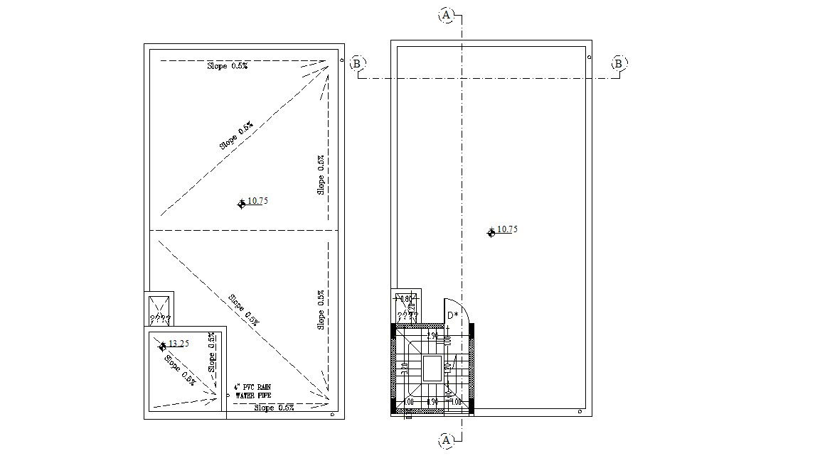 this is the simple residence house terrace slope plan with staircase cabin design and PVC pile line for water rain drainage. this drawing has been drafted in AutoCAD software format.