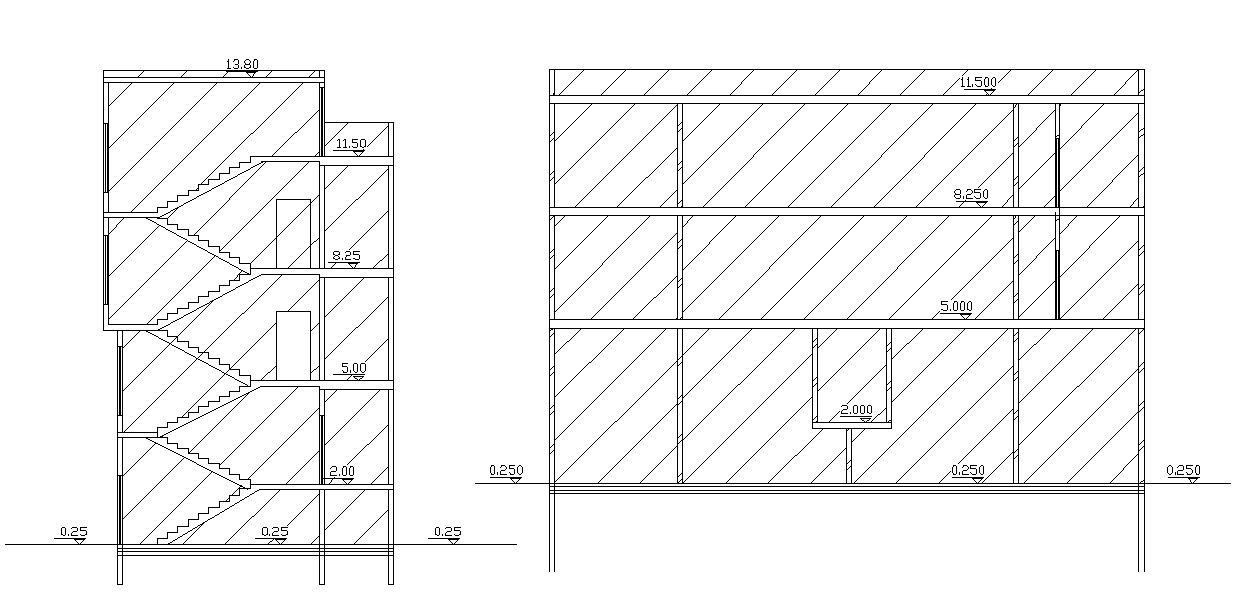 this is the two section of house building with floor levels dimension details, some hatching design in section, stair section and much more other details in the architecture section.