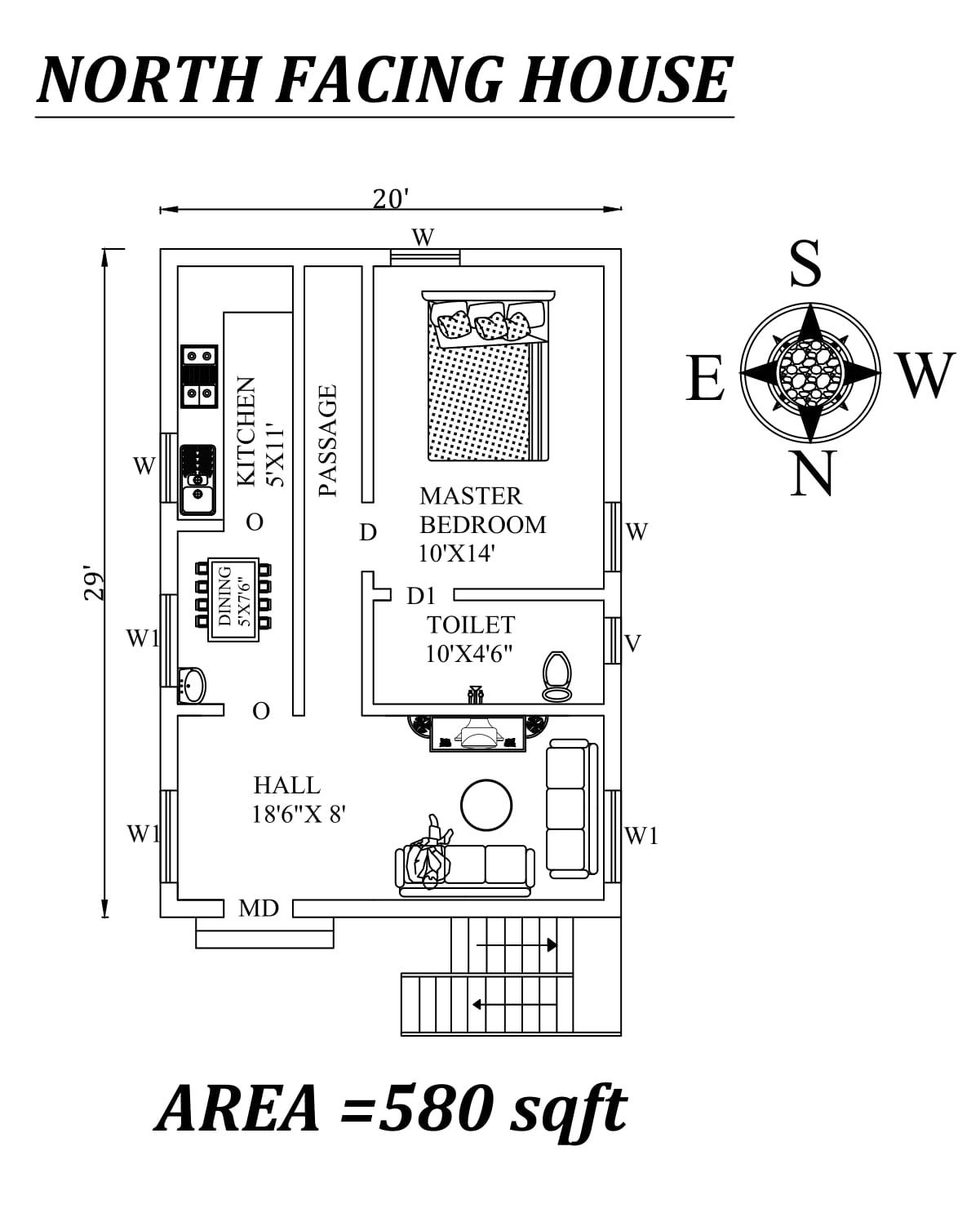 This Autocad Drawing file shows 29'x20' 1bhk North facing Small House plan As Per Vastu Shastra. The total buildup area of this house is 580 sqft. The kitchen placed in Southeast direction, Dining near the kitchen is in the east direction. The Hall Placed in the Northeast direction. The master bedroom available in the southwest direction with the attached toilet is in the west direction. A staircase is available in the northwest outside of the house. Download Autocad Drawing file and PDF file.