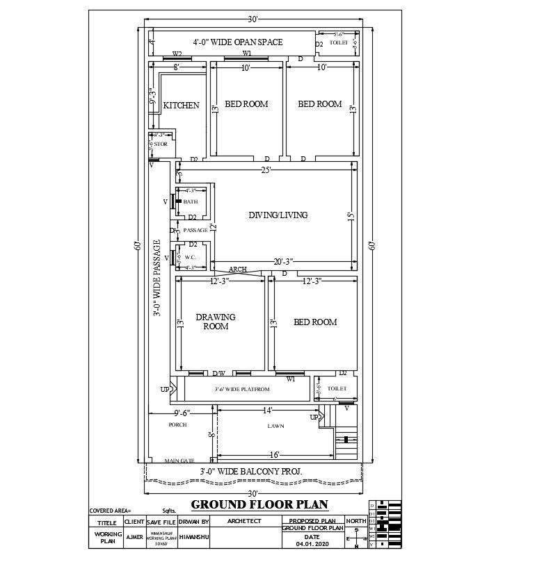 house 3bhk working plan 30' X 60' south facing ground floor plan design includes 3 bedrooms, kitchen, drawing room, dining with living room and 3 front side balcony.