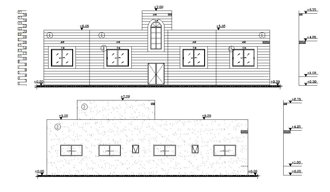 this is the two elevations of residential house building includes floor levels dimension, groove design in elevation also some hatching in it.doors and windows marking in elevation.