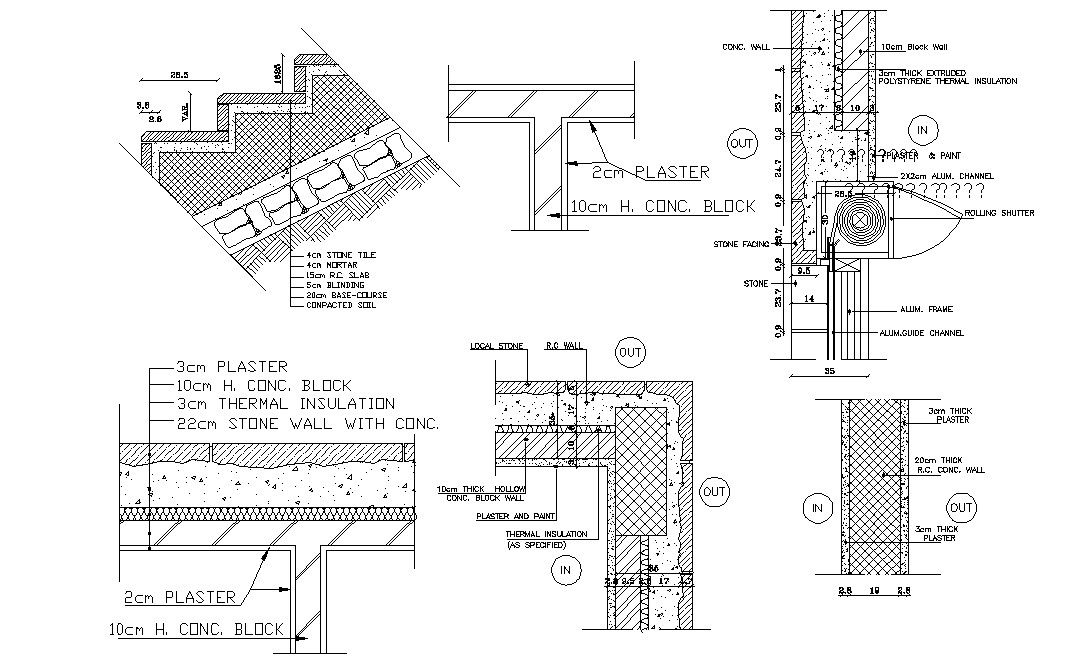this is the detail drawing of shops rolling shutter with wall section, steps surface material fixing details, concrete box , thermal insulation details, stone wall desing and much more other details related to floors and wall section.