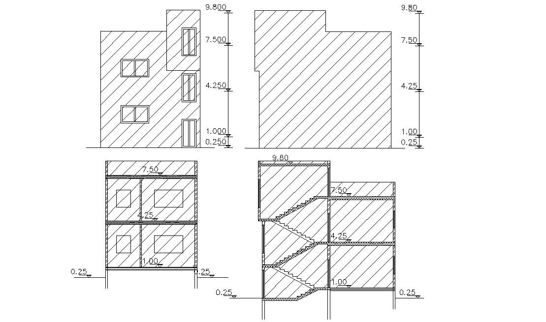 This is the simple two storey house building sectional elevation design with dimension and hasting design also has RCC floor and slab detail. download house building CAD drawing.