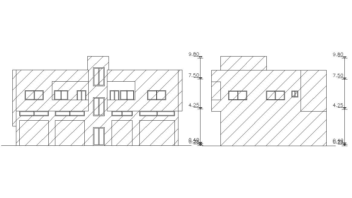 This is the simple 2 storey building elevation design CAD drawing shows a combination of commercial shops and residential house design with dimension details. download DWG file of building design CAD drawing.