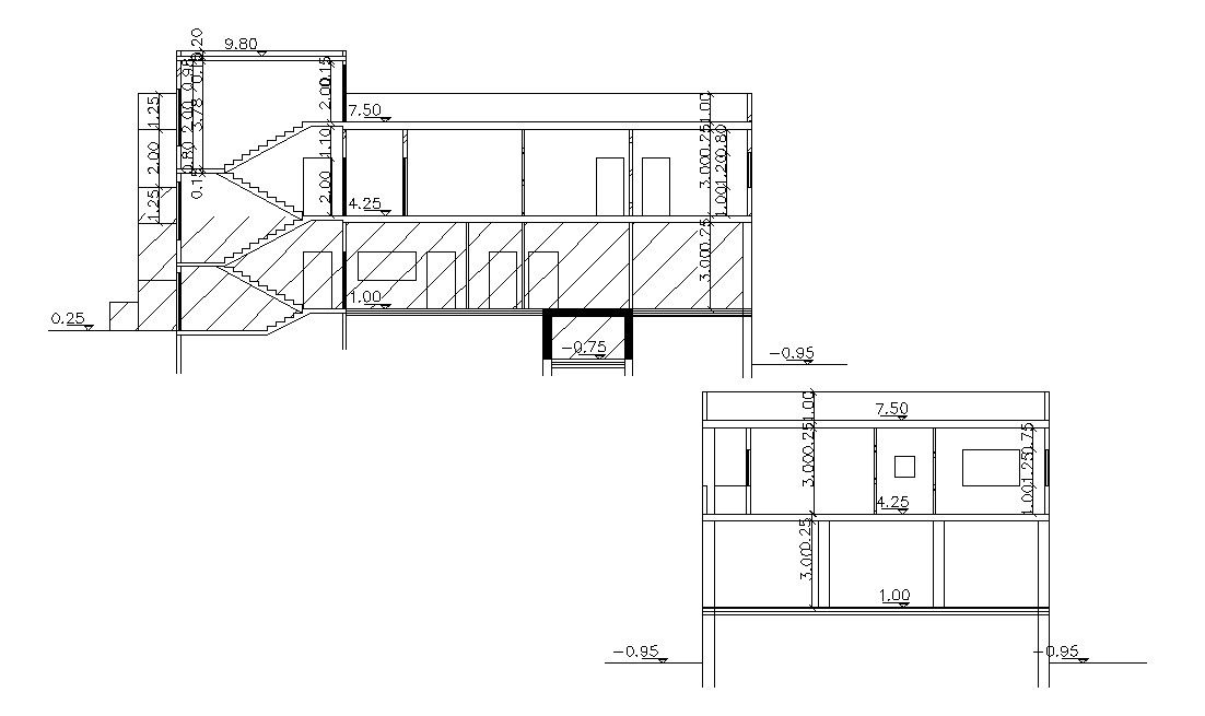 This is the simple 2 storey residence house building section drawing with shows floor level detail, RCC slab and staircase with dimension detail. download free DWG file of building section design and get more detail in this CAD drawing.