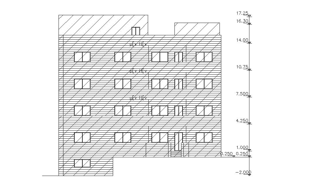 4 storey apartment building front elevation design with dimension detail, wall texture, door and window set up design. download apartment house building design AutoCAD drawing.