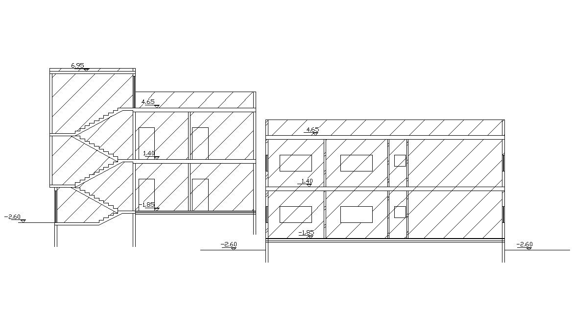this is the sections of residential building with floor levels dimension details, doors windows marking in sections, some texting and hatching details in it, use this drawing in related project.