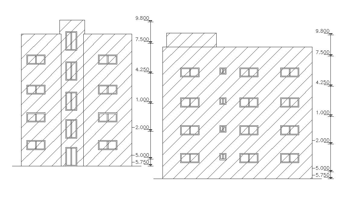 The architecture Residence Building Elevation design which shows 4 storey building structure detail, dimension detail and hatching design. download DWG file of apartment building elevation design DWG file.