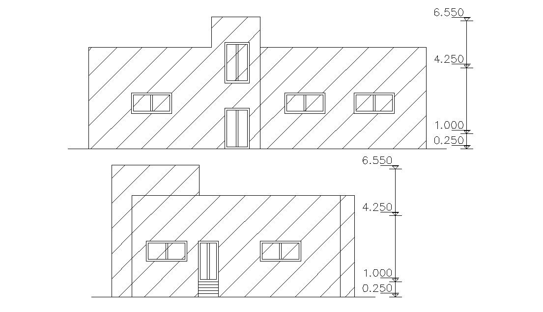 this is the drawing of simple elevation design with floor levels dimension details, its a single-story building elevation with some hatching design.